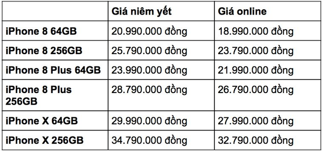 Theo đó, các máy iPhone 8, iPhone 8 Plus, iPhone X tất cả phiên bản bộ nhớ 64GB và 256GB đều được giảm 2 triệu đồng, áp dụng khi mua online.