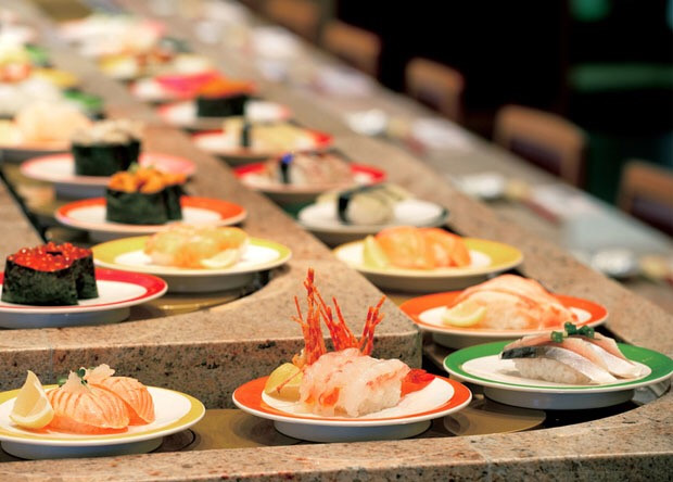Kaiten-zushi (Nhật): Những nhà hàng kaiten-zushi – tức sushi băng chuyền là lựa chọn hợp túi tiền nhất cho cuộc sống đắt đỏ ở Nhật Bản. Tại nhiều nơi, món ăn này chỉ tầm 100 ¥. Bạn tự chọn lấy phần ăn cho mình và xếp dĩa thành chồng để thanh toán vào cuối bữa ăn. Ảnh: Slowearjournal.com.