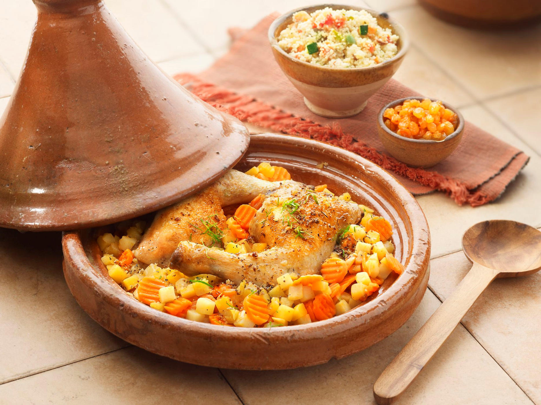 Tajine (Morocco): Từ “tajine” thực chất vốn dùng để chỉ một loại dụng cụ bằng đất nung kiểu dáng đặc biệt. Nó được sử dụng khi nấu món ăn này, nên từ đó thành tên gọi cho một đặc sản của Morocco. Tajines thường bao gồm thịt đỏ được nấu chín chậm với trái cây khô, rau và các loại hạt, hoặc thịt gà với chanh và ô liu. Món ăn này chỉ tốn khoảng 30 dh. Bạn có thể vào các nhà hàng nhỏ ở Medina để có giá rẻ nhất. Ảnh: Thespruceeats.com.