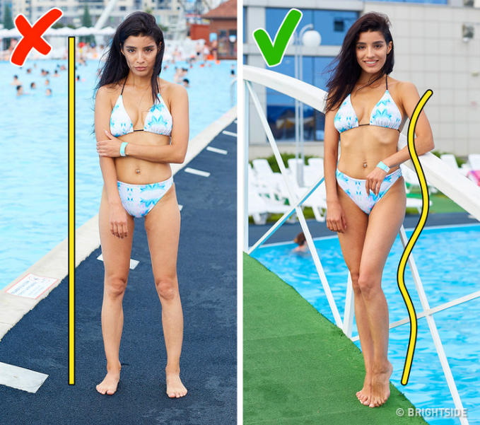 Khi chụp ở bể bơi, bạn không nên tạo dáng thành những đường thẳng và vuông góc bởi sẽ khiến tỷ lệ cơ thể của bạn bị "nuốt". Đặc biệt, bạn không nên để chân song song mà nên hếch một chân lên, nên thả lỏng, ưỡn ngực và hơi xoay vai về phía ống kính. Đường cong cơ thể sẽ xuất hiện.