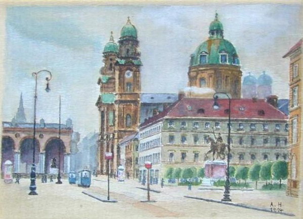 The Alter Hof in Munich. Tranh màu nước vẽ bởi Adolf Hitler, 1914