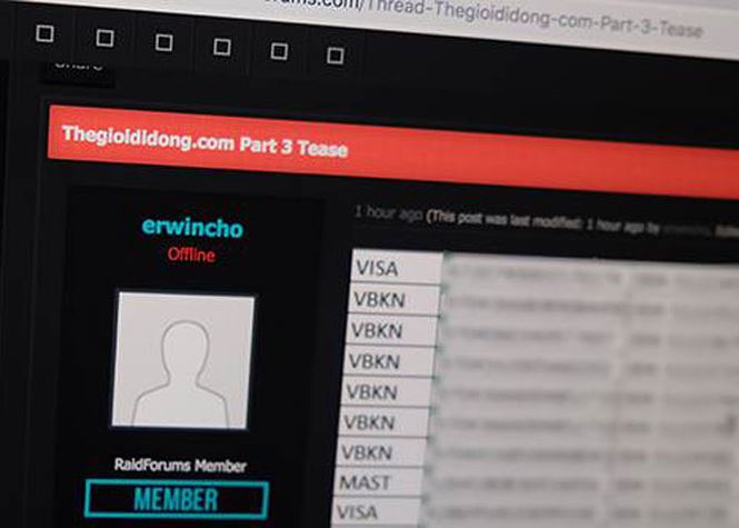 Trong hai ngày 6/11 và 7/11, một tài khoản diễn đàn RaidForums liên tiếp tung lên những tệp dữ liệu cá nhân, tuyên bố rằng của khách hàng Thế Giới Di Động (TGDĐ). Trong đó, thông tin quan trọng gồm 5,4 triệu địa chỉ email, 31.000 số thẻ ngân hàng kèm ngày giờ giao dịch. Đến nay, TGDĐ phủ nhận hệ thống của họ bị hack, chưa xác định chính xác đây có phải dữ liệu của khách hàng TGDĐ hay không, chỉ biết việc lấy được 16 số trên thẻ không đủ để hacker rút được tiền.