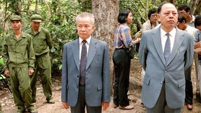 Hình: Khieu Samphan (giữa), Phó Chủ tịch Chính quyền Liên minh của Kampuchea Dân chủ và Ieng Sary (phải), Bộ trưởng Ngoại giao, ăn mặc đẹp để ra đón phái đoàn Trung Quốc ở căn cứ Dong Rek của Khmer Đỏ năm 1985.