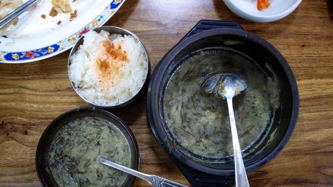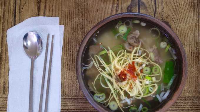 Mỗi sáng bạn sẽ bắt gặp nhiều người xếp hàng bên ngoài một nhà hàng gia đình trong chợ Sin-Sijang phía đông thành phố Andong. Quán ăn chỉ phục vụ món duy nhất là Seonji gukbap – canh tiết bò hầm với gạo, tỏi và ớt bột, được cho là khá giàu dinh dưỡng.