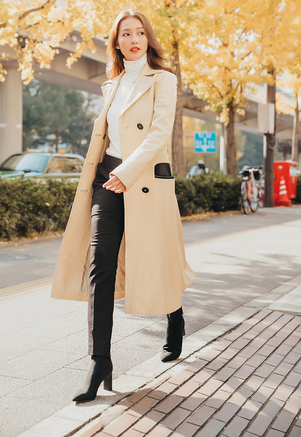 Cũng chọn áo khoác dáng dài, Trà Ngọc Hằng ghi điểm hoàn hảo khi mix mẫu áo màu camel với quần jeans cạp cao và áo trắng nền nã. Đôi boots cao gót màu trắng là “trợ thủ” đắc lực giúp người đẹp tôn vóc dáng mảnh mai.