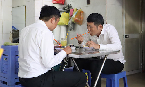 Khoảng 2 giờ chiều, trời đang nóng oi ả, ông Lương Cao Đỉnh (46 tuổi, ngụ Q.8) chạy chiếc wave cà tàng đến quán, gọi mấy cuốn bò bía với dĩa gỏi khô bò và ly nước mía. Vừa ăn vừa chọt chọt vào smartphone, ông Đỉnh cho biết ông đã ăn ở đây hơn 10 năm vì giá cả bình dân và ông thường chỉ đi ăn một mình.