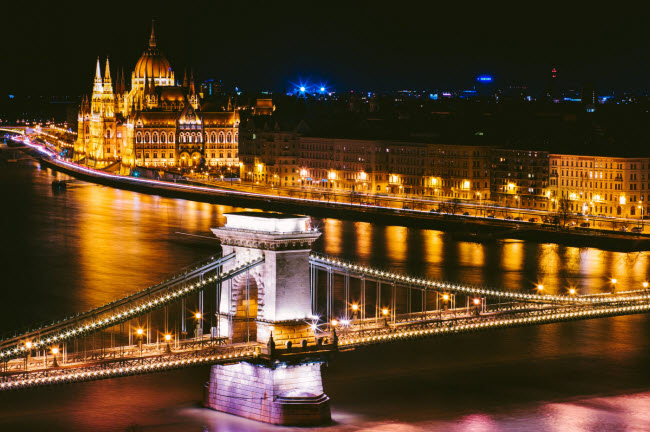 Budapest, Hungary: Khi mặt trời phía dưới đường chân trời và những bóng đèn điện được bật lên, thành phố Budapest thay đổi hoàn toàn so với thời gian ban ngày. Du khách có thể đi thuyền hay đi bộ dọc sông Danube, chiêm ngưỡng tòa nhà quốc hội và lâu đài Buda.