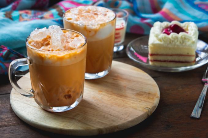 Món đường phố làm xiêu lòng nhiều du khách ở Thái Lan là trà sữa. Trà sữa Thái phổ biến có màu cam và màu xanh. Loại trà màu cam đặc trưng được pha từ hồng trà với sữa (sữa bột, sữa đặc hoặc kem). Ly trà sữa đậm vị béo nhưng vẫn không mất đi mùi trà đặc trưng. Du khách có thể bắt gặp đồ uống giải nhiệt này trên bất cứ nơi nào ở Thái Lan với giá cả phải chăng. Ảnh: Shutterstock/girl-think-position.