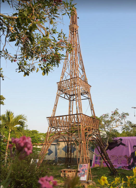 "Tháp Eiffel" tự chế nằm ở sau vườn là nơi khách có thể chụp hình lưu niệm.