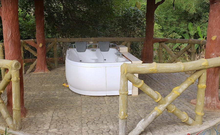 Bồn tắm thơ mộng ''lộ thiên'' giữa khu vườn xanh mát. Nói theo lời MC Thanh Bạch: "Phải gan lắm, phải lãng mạn lắm mới dám tắm với cái bồn này".