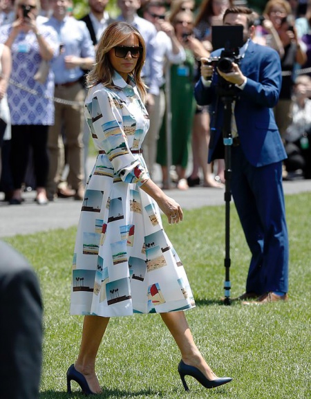 Đệ nhất phu nhân Mỹ kết hợp váy với chiếc thắt lưng mảnh và đôi giày cao gót màu xanh hải quân của hãng Christian Louboutin. Bà buông tóc, mang theo kính râm để che nắng.