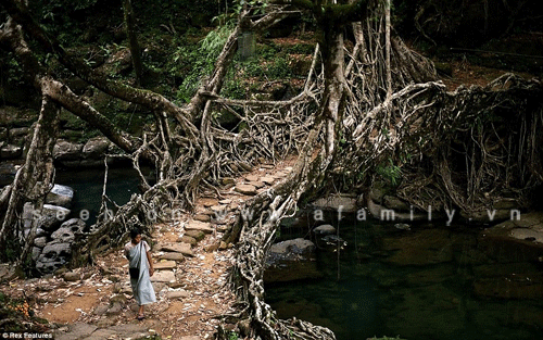 Những cây cầu ở bang Meghalaya, nơi ẩm ướt nhất thế giới, được làm hoàn toàn bằng rễ cây để ngăn chúng thối rữa do độ ẩm. Quá trình tạo ra những cây cầu phải mất nhiều năm để hoàn thành nhưng những cây cầu được xây dựng theo cách này có khả năng chịu đựng tốt hơn nhiều so với những cây cầu làm bằng gỗ.