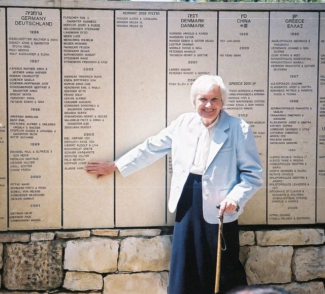 Một người Do Thái sống sót nhờ sự che chở của ông Karl đặt tay cạnh tên ông trên bức tường ghi danh những người có công trong Thế chiến II.