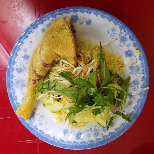 Phần đùi gà chín vàng được xếp cùng cơm, trang trí rau dăm, giá, hành củ muối. Ảnh: Tung Nguyen.