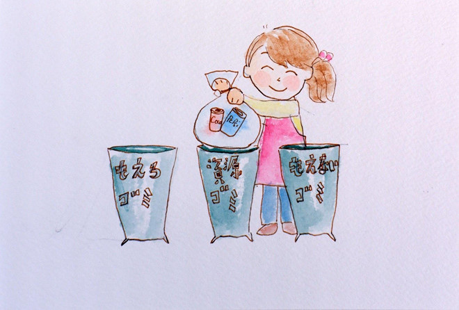 Trẻ em Nhật Bản được học phân loại rác từ nhỏ. Tranh minh họa: Tama Duy Ngọc