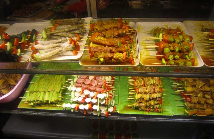 Các món nướng ở Malaysia cũng rất đặc biệt, đây chính là lý do những quầy nướng ở nơi đây luôn luôn chật cứng người. Có 4 sự lựa chọn thịt xiên nướng ở Malaysia. Thịt gà (ướp trong bột nghệ và nước sốt gia vị đặc biệt), thịt cừu, thịt bò và thịt bê. Ở đây không có thịt lợn bởi Malaysia là một đất nước Hồi giáo. Theo nhận xét của nhiều thực khách thịt bò được ưa chuộng nhất, nhưng nhìn chung cả 4 món nướng đều hấp dẫn với những bí quyết ướp và nước sốt riêng của mỗi nhà hàng.