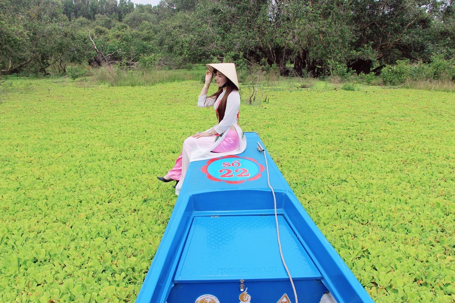 Du khách di chuyển bằng xuồng máy, lướt trên mặt bèo, tận hưởng cảnh thiên nhiên hoang sơ bao la của rừng tràm Trà Sư.