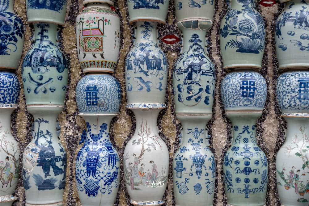 Ngay từ lúc bước xuống xe, du khách sẽ choáng ngợp bởi bức tường được ốp bằng những bình sứ, những viên ngói, những món đồ cổ với sắc màu , hình dáng phong phú. Chúng được xếp ngăn nắp gọn gàng thành tầng lớp với số lượng lớn khiến du khách hoa mắt.
