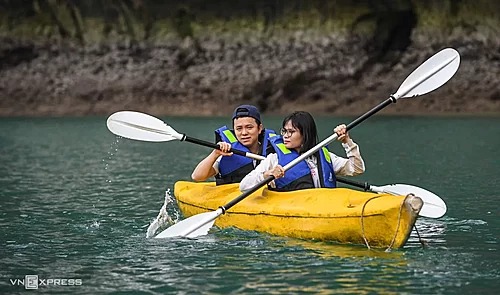 Trải nghiệm này thích hợp cho những người ưa mạo hiểm, thích các hoạt động ngoài trời ở Cát Bà. Nước tại đây trong, có thể nhìn thấy cả những rạn san hô và rong biển phía dưới mái chèo. Giá thuê thuyền là 50.000 đồng mỗi chiếc. Ảnh: Kiều Dương.