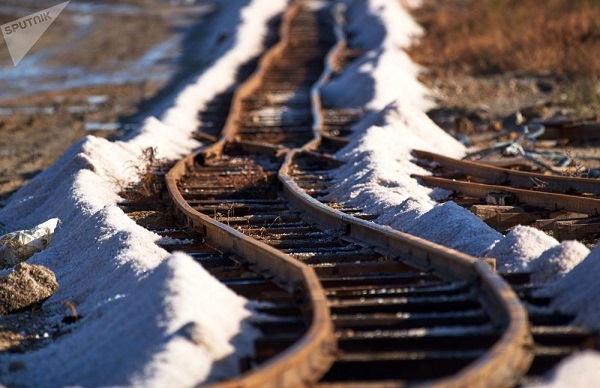 Đường ray trên bãi khai thác muối tại hồ Sasyk-Sivash, ngoại ô Yevpatoria
