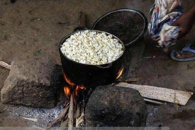 Bỏng ngô được bung trong một cái nồi sắt, thậm chí người dân còn nấu chúng với 3 viên đá làm thành bếp.