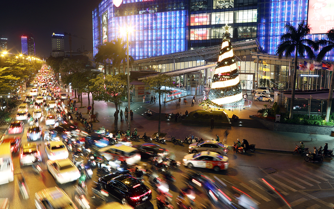 Tại một trung tâm mua sắm ở ngã tư phố Liễu Giai - Đào Tấn, cây thông Noel cao hơn 5m lấp lánh đèn màu mang đến cảm giác không khí giáng sinh đã cận kề.