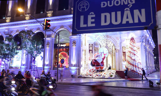 Ông già Noel đứng ở cửa ra vào tòa nhà ở ngã tư Lê Duẩn - Nguyễn Thái Học.