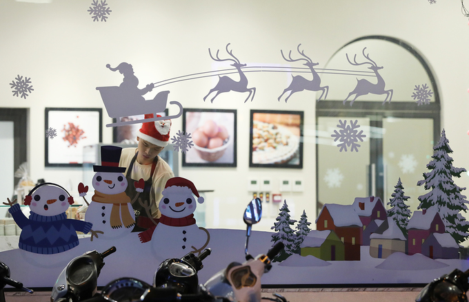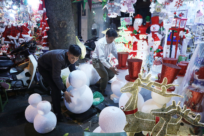 Các tiểu thương ở phố Hàng Mã đang bày biện và trang trí những ông già tuyết bằng xốp; giá mỗi sản phẩm từ 300.000 đến 700.000 đồng tuỳ kích cỡ.