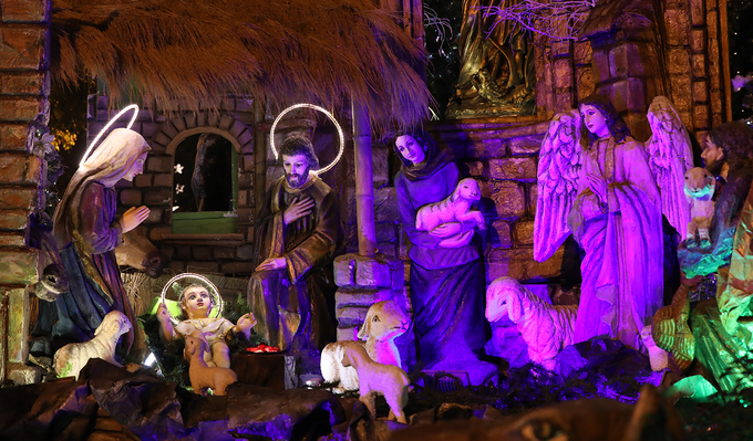 Phía trước Nhà thờ Lớn, hoạt cảnh Chúa Giêsu bên máng cỏ được sắp đặt sát đường Nhà Chung để người dân tiện chiêm ngưỡng và chụp hình lưu niệm.