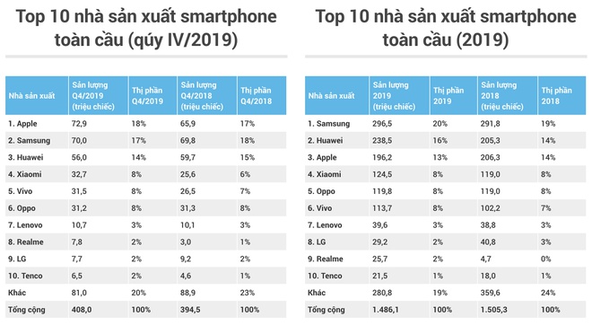 Thị trường smartphone quý IV/2019 và cả năm 2019.