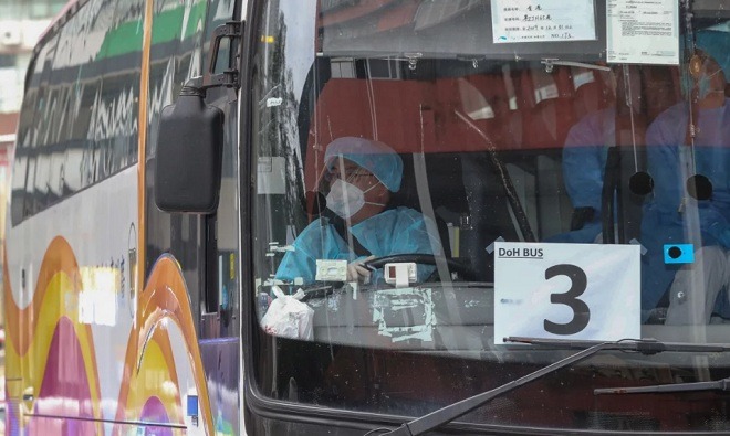 Xe buýt chở người Hong Kong trở về từ du thuyền Diamond Princess.