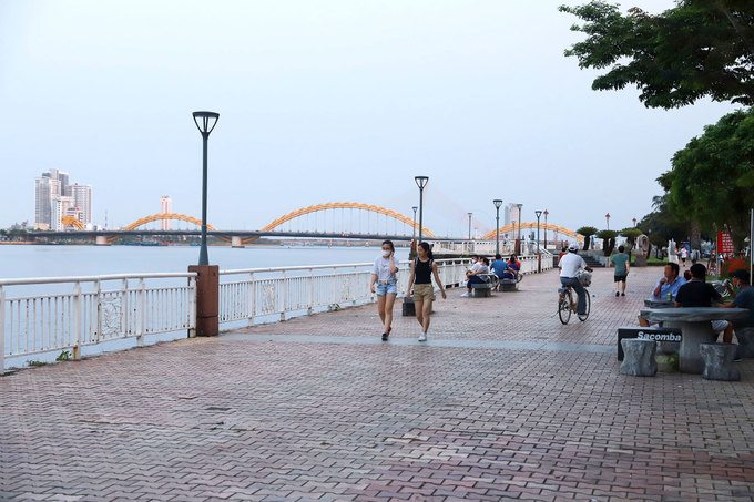 Đường đi bộ ven sông Hàn là nơi tập thể dục, vui chơi hay đánh cờ tướng của hàng nghìn người dân, nay vắng vẻ. Thành phố lưu ý người dân đến điểm công cộng cần giữ khoảng cách tối thiểu 2 m giữa người với người.