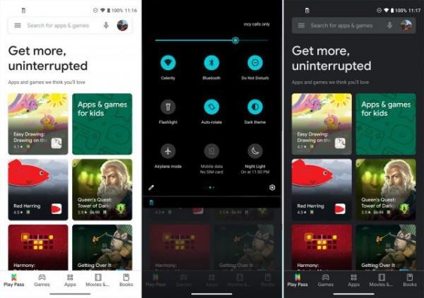 Sử dụng giao diện tối. Phiên bản Android 10 đã tích hợp chủ đ*ề tối giúp chuyển các ứng dụng và giao diện người dùng sang màu đen. Bạn có thể kíc*h hoạt giao diện tối trong phần cài đặt hệ thống. Một số thiết bị cũng có t*ùy chọn để lên lịch cho chủ đ*ề tối tự độn*g bật vào mỗi đêm và tắt vào buổi sáng. Ảnh: ExtremeTech.