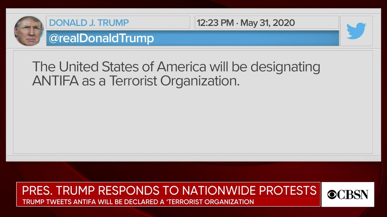 Trong khi đó, cũng trên Twitter, Tổng thống Mỹ Donald Trump tuyên bố Washington sẽ coi Antifa là một tổ chức khủng bố.