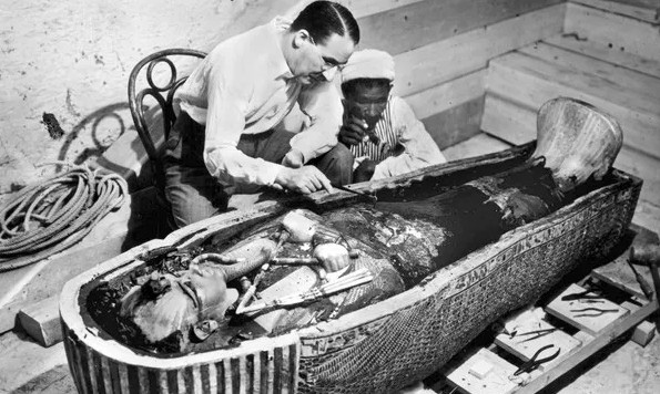 Howard Carter bên cạnh quan tài của Pharaoh Tutankhamun.