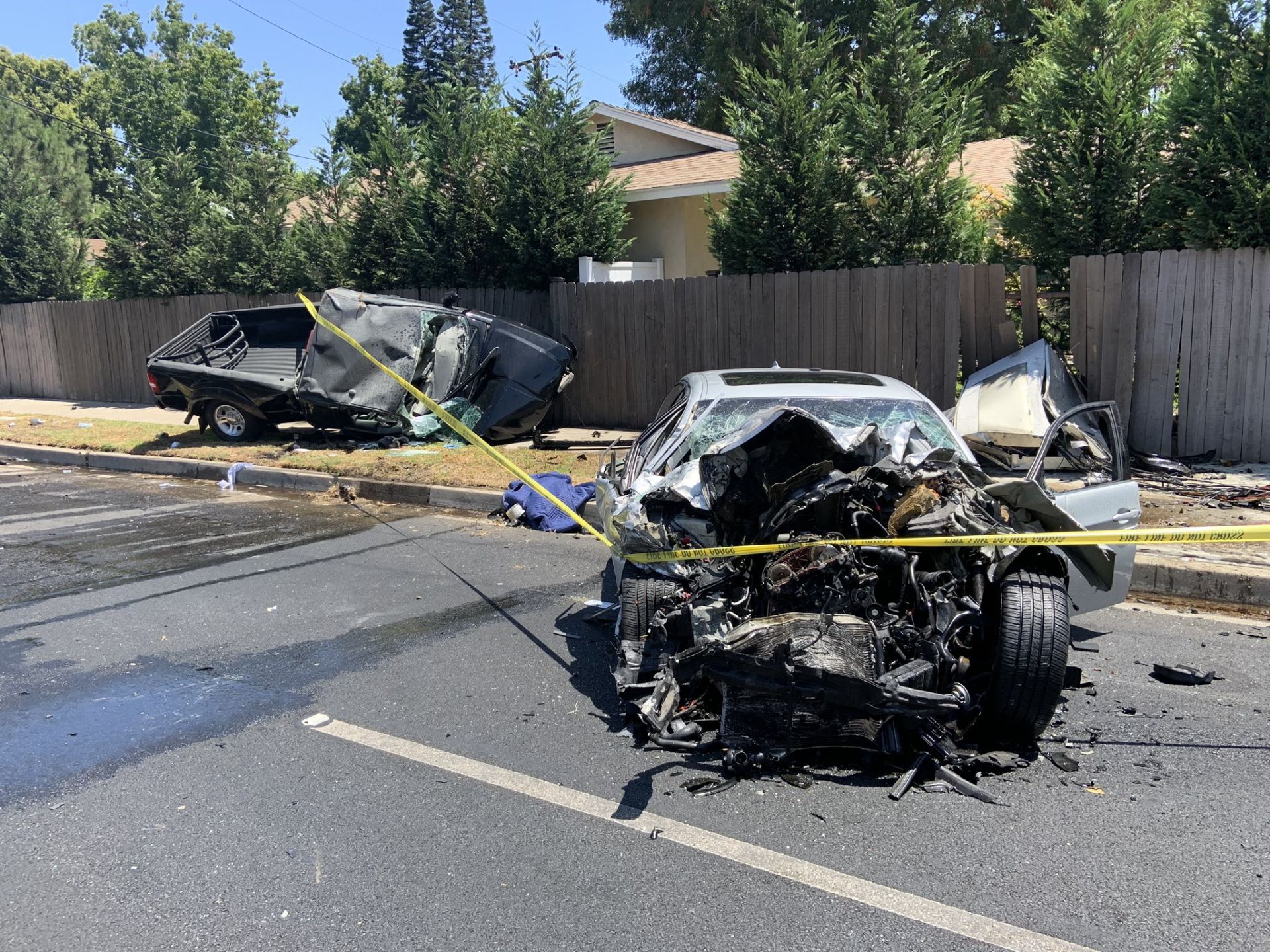 Cú tông khiến chiếc xe pickup truck văng khoảng 60 foot vô hàng rào nhà dân rồi bốc cháy.