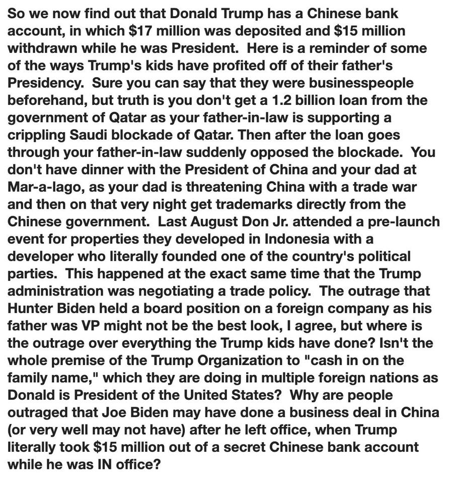 Những vụ khơi bày này đến sau khi Trump cáo buộc đối thủ của ông ta, Joe Biden, là “nhu nhược trước Trung Quốc" và miêu tả gia đình Biden như “những kẻ bán nước" cho Trung Quốc. Chiến dịch phe Trump đã chạy nhiều quảng cáo chống đối con trai của Biden về việc “cấu kết một hợp đồng trị giá một tỷ Đô-la Mỹ" với ngân hàng quản lý bởi nhà nước Bank of China, những cáo buộc này vẫn chưa được xác thực.