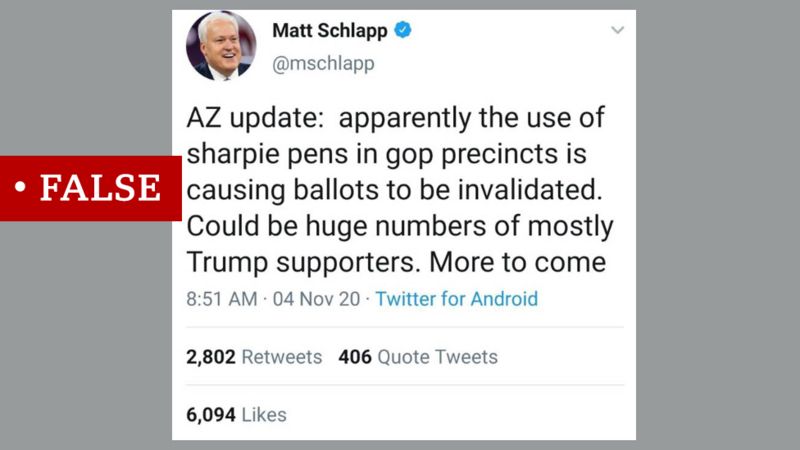 Có những tweet cáo buộc có một kế hoạch làm giảm số phiếu ở các khu vực ủng hộ đảng Cộng hòa của tiểu bang bằng cách phân phát bút Sharpie – bút đánh dấu vĩnh viễn – để mọi người điền vào lá phiếu của họ.