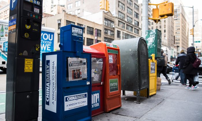 A China Daily newspaper box in Midtown Manhattan, New York City, on Dec. 6, 2017. China Daily is a Chinese state-run newspaper published in the English language. (Benjamin Chasteen/The Epoch Times)