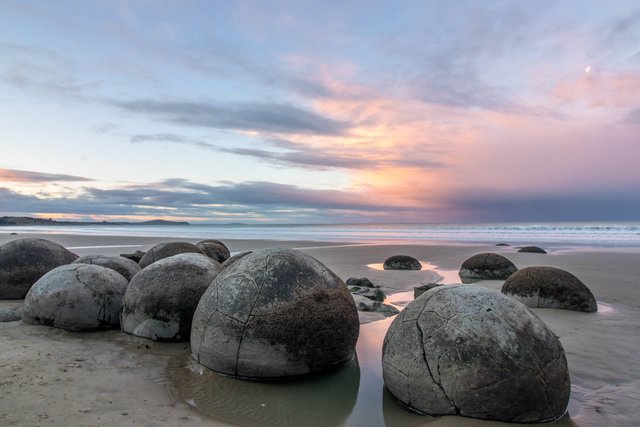 Những khối đá "trứng rồng" nằm rải rác trên bãi biển Moeraki Boulders ở New Zealand
