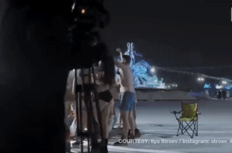Bất chấp nhiệt độ ngoài trời hạ sâu -39 độ C, các thanh niên vẫn mặc sức cởi trần nhảy nhót vui vẻ khi chỉ mặc bikini hoặc cởi trần.