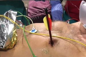 Ở vùng miền núi anh chàng vô tình bị bắn trúng cung tên mắt kẹt vô bụng, người nhà anh không dám rút ra đành để y như vậy tới bệnh viện nhờ lấy ra.