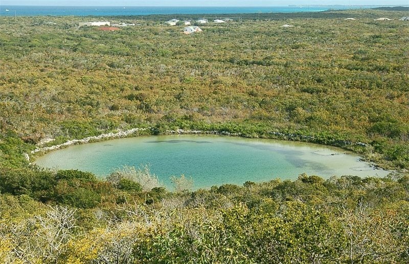 Một số hố xanh cũng xuất hiện trên đất liền, ví dụ như Hố xanh Watling nằm trên đảo Bahamian của San Salvador. Mặc dù nằm giữa một hòn đảo nhiệt đới nhiều mưa, hố xanh Watling không có nước ngọt cho thấy hố phải được nối với đại dương bằng một đường hầm dưới lòng đất.