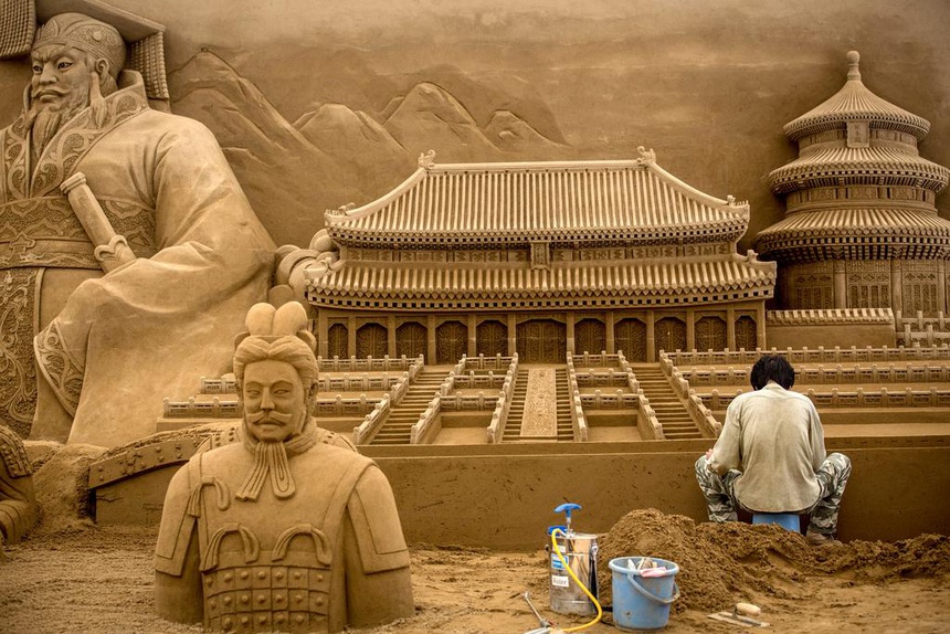Những nghệ sĩ đầu tư rất nhiều công sức để tạo ra các kiệt tác đơn sắc từ hàng triệu hạt cát. Họ tỉ mỉ tạo hình từ những chi tiết nhỏ nhất, cách lát gạch trang trí đến ô cửa sổ, cầu thang...để mô phỏng các công trình kiến trúc phức tạp. Trong ảnh, nhà điêu khắc cát Zhang Weikang thực hiện tác phẩm về các di tích lịch sử ở Trung Quốc cho triển lãm nghệ thuật cát Yokohama tại Nhật Bản năm 2014.
