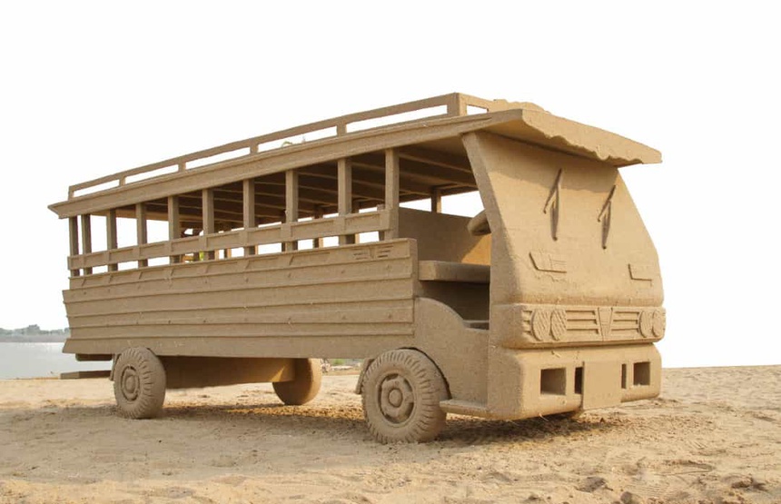 Chỉ từ 2 thành phần cơ bản là cát và nước, những tác phẩm điêu khắc dần hiện ra dưới bàn tay khéo léo của các nghệ sĩ. Cát tốt dùng để điêu khắc thường có phù sa và đất sét giúp kết dính các hạt cát có hình dạng bất thường lại với nhau. Chiếc xe bằng cát có kích thước như thật này là tác phẩm trong lễ hội Songkran năm 2014 ở Thái Lan.