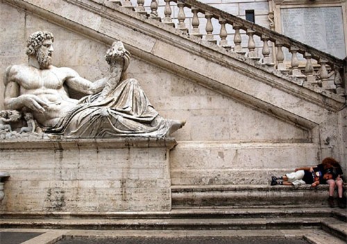 Tòa thị chính: Hai khách du lịch nghỉ ngơi bên cạnh một bức tượng ở phía trước cửa Campidoglio, hội trường thành phố Rome.Các bức tượng do nghệ sĩ Ý Matteo Bartolani xây dựng vào năm 1588 mang hình ảnh đại diện sông Tiber của Rome.