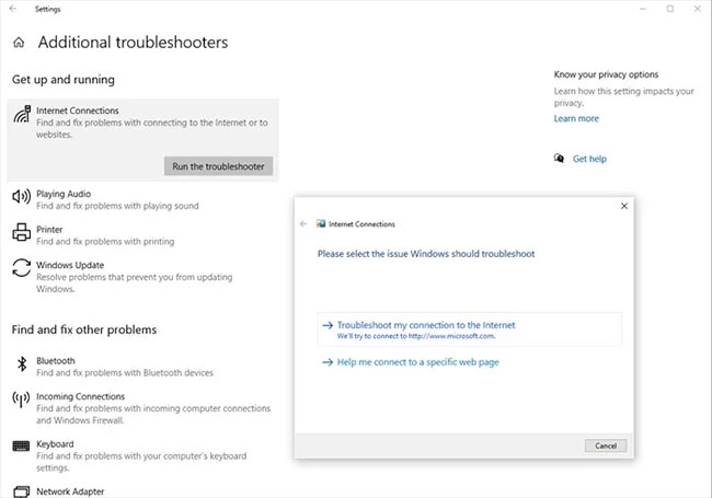 Trong cửa sổ Settings, nhấp vào Update & Security > Troubleshoot > Additional troubleshooters > Internet Connections > Run the troubleshooter, sau đó làm theo hướng dẫn và xem liệu cách đó có giải quyết được sự cố của bạn hay không.