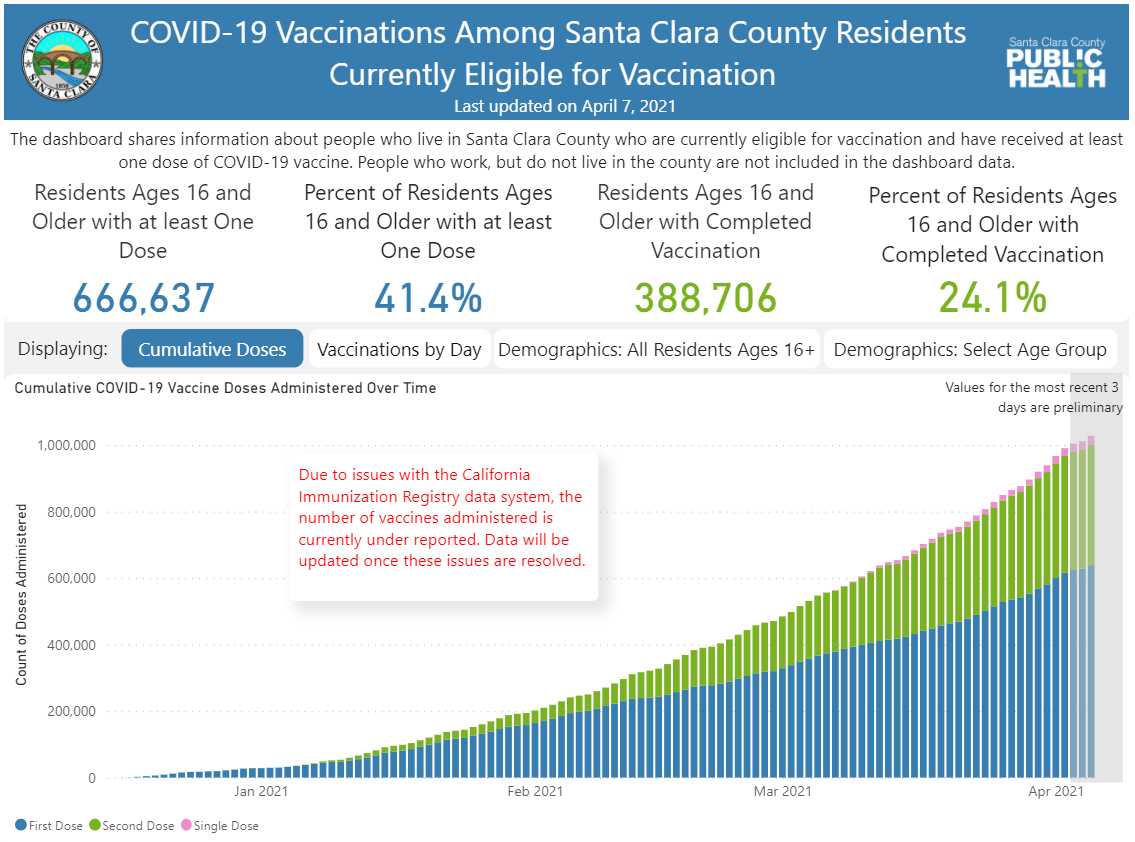 Sau thông báo đề nghị từ Trung tâm Kiểm soát và Phòng Ngừa Dịch bệnh (CDC) và Cơ quan Quản lý Thực phẩm và Dược phẩm Hoa Kỳ (FDA), Hệ thống Y tế Quận Santa Clara đã tạm ngưng tiêm vaccine Johnson & Johnson (J&J) cho cộng đồng. Quận dự kiến có thể thay thế vaccine cho tất cả các cuộc hẹn đã lên lịch bằng vaccine Pfizer hoặc Moderna.