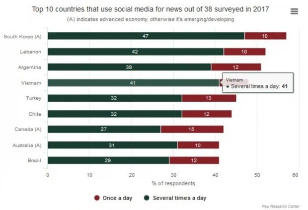 Báo cáo trên cũng cho thấy, mỗi ngày người dùng Việt dành ra khoảng 7 giờ để "lướt" mạng, trong đó có 2,5 giờ dành riêng cho mạng xã hội. Vì vậy, hiện tại phần lớn người dân Việt Nam, đặc biệt là thế hệ trẻ, thế hệ Z tiếp nhận tin tức từ Internet, phổ biến nhất là từ các trang mạng xã hội như Facebook, Instagram, Twitter...