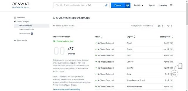 Metadefender cho phép bạn upload một file APK để file đó có thể được quét bởi nhiều công cụ antivirus khác nhau. Đối với các file APK ở dạng tệp nén, chúng sẽ được trích xuất tự động để thực hiện quy trình quét trên từng tệp riêng lẻ bên trong. Tuy nhiên, quá trình quét toàn bộ tệp APK chưa được trích xuất cũng sẽ được thực hiện. Người dùng chỉ cần kéo và thả các tệp của mình vào công cụ quét, và một báo cáo sẽ được tổng hợp chỉ sau vài giây.
